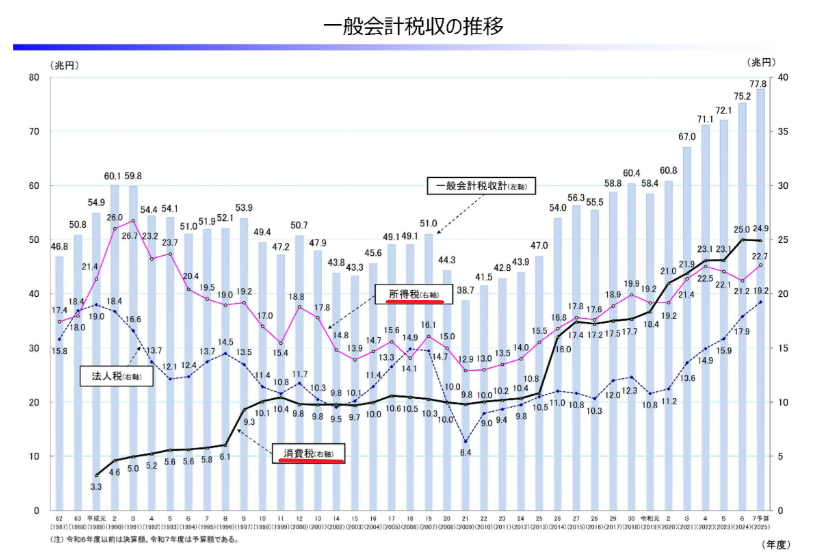 消費税の導入とともに、所得税収が減少しているのが分かります。
