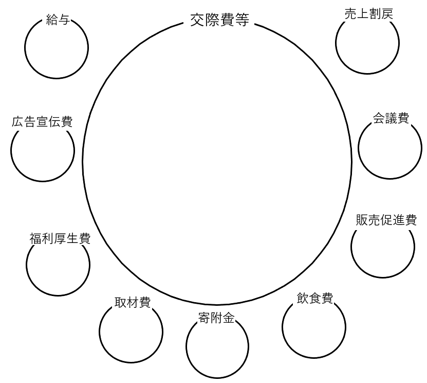 それは「給与、広告宣伝費、福利厚生費、取材費、寄附金、飲食費、販売促進費、会議費、売上割戻」などです。
